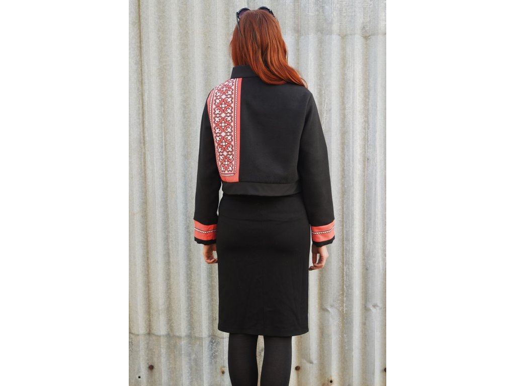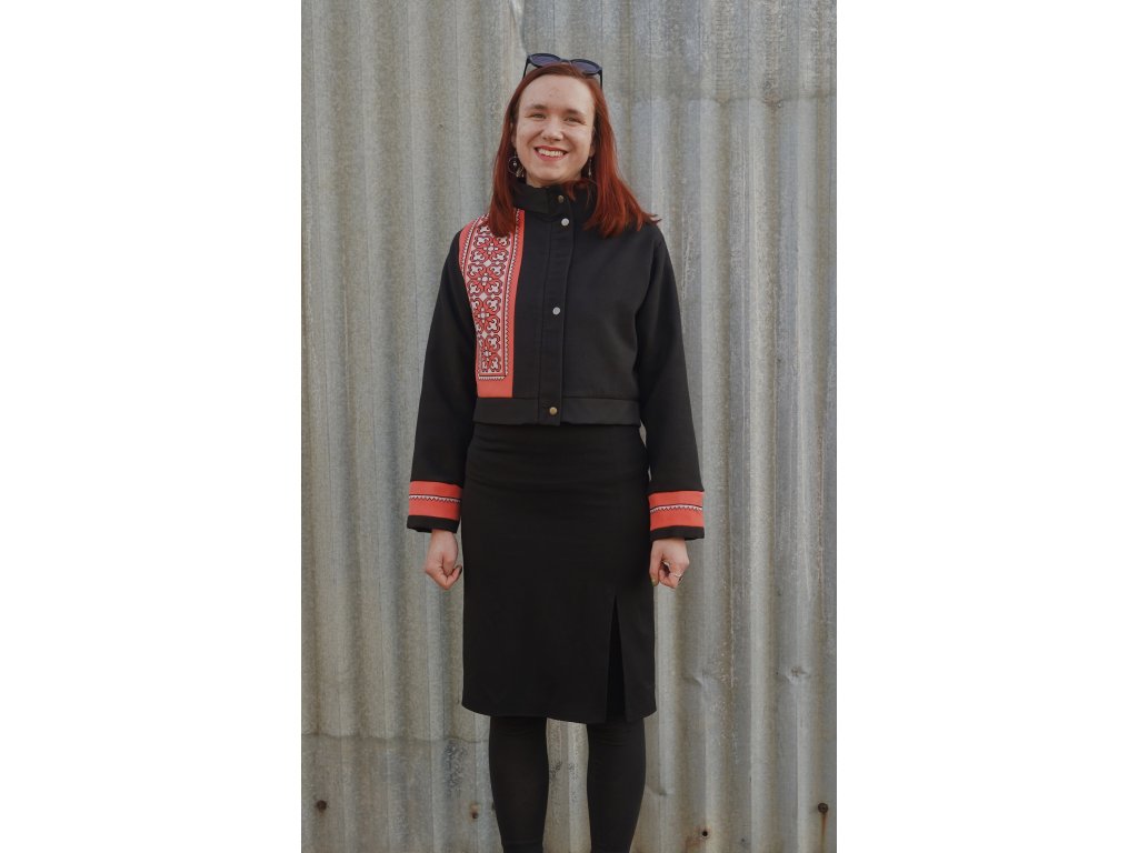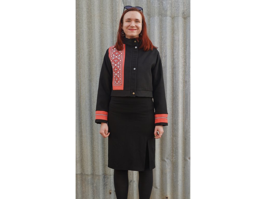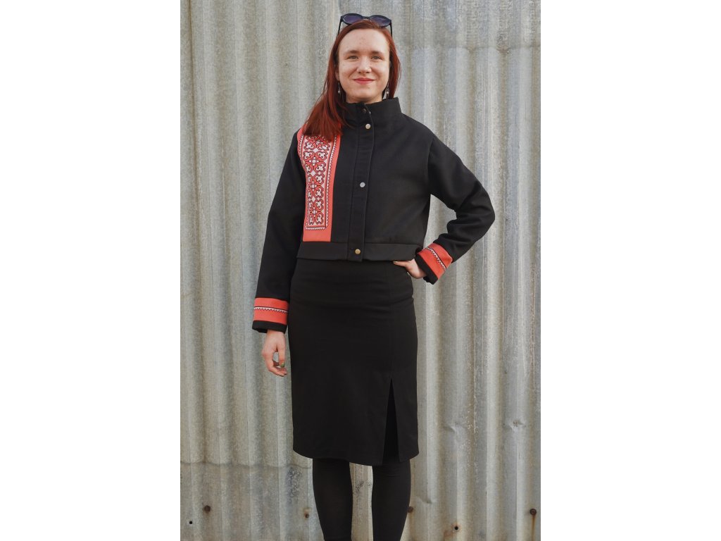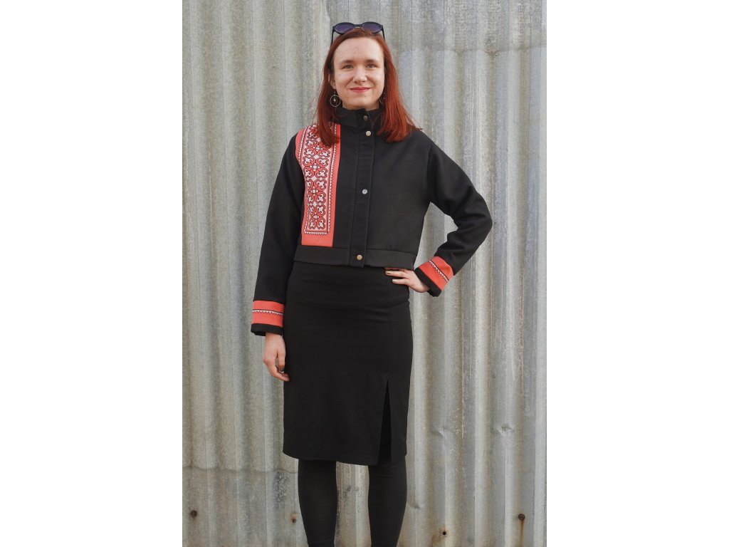 Upcyklovaná bunda ze zbytkových textilií. Je krátká do pasu. Výrazným dekorem jsou výseče s folklorními výšivkami. Bunda je podšitá. Zapíná se na zip, který je překrytý légou s kovovými druky.