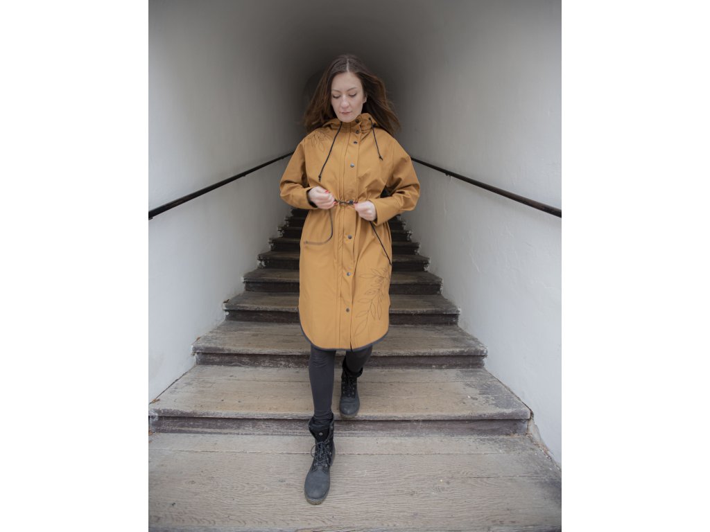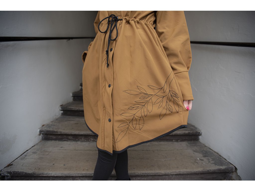 Kabát má nebírané rukávy stažené do manžety, pohodlnou objemnou kapuci s šňůrami ke stažení, švové kapsy, které nejsou na první pohled viditelné. Kabát se zapíná na zip, který překrývá léga s druky. V pase je šňůra, pomocí které je možné kabát stáhnou tak, aby dokonale padl postavě. Dolní kraje kabátu jsou obloukově střiženy. Kabát je dekorován autorskými výšivkami.
