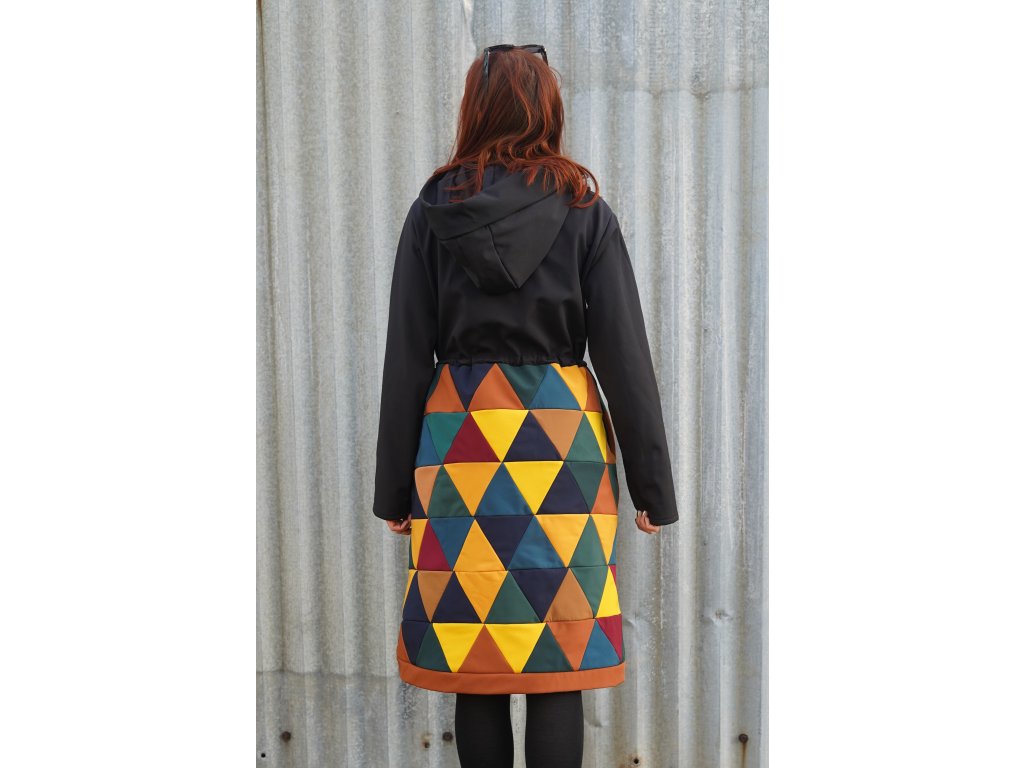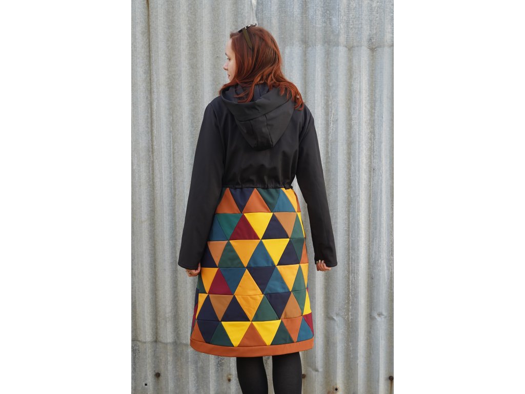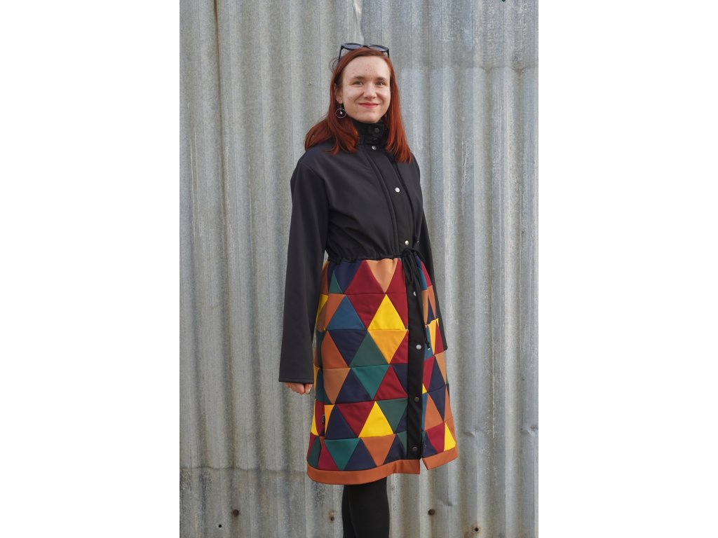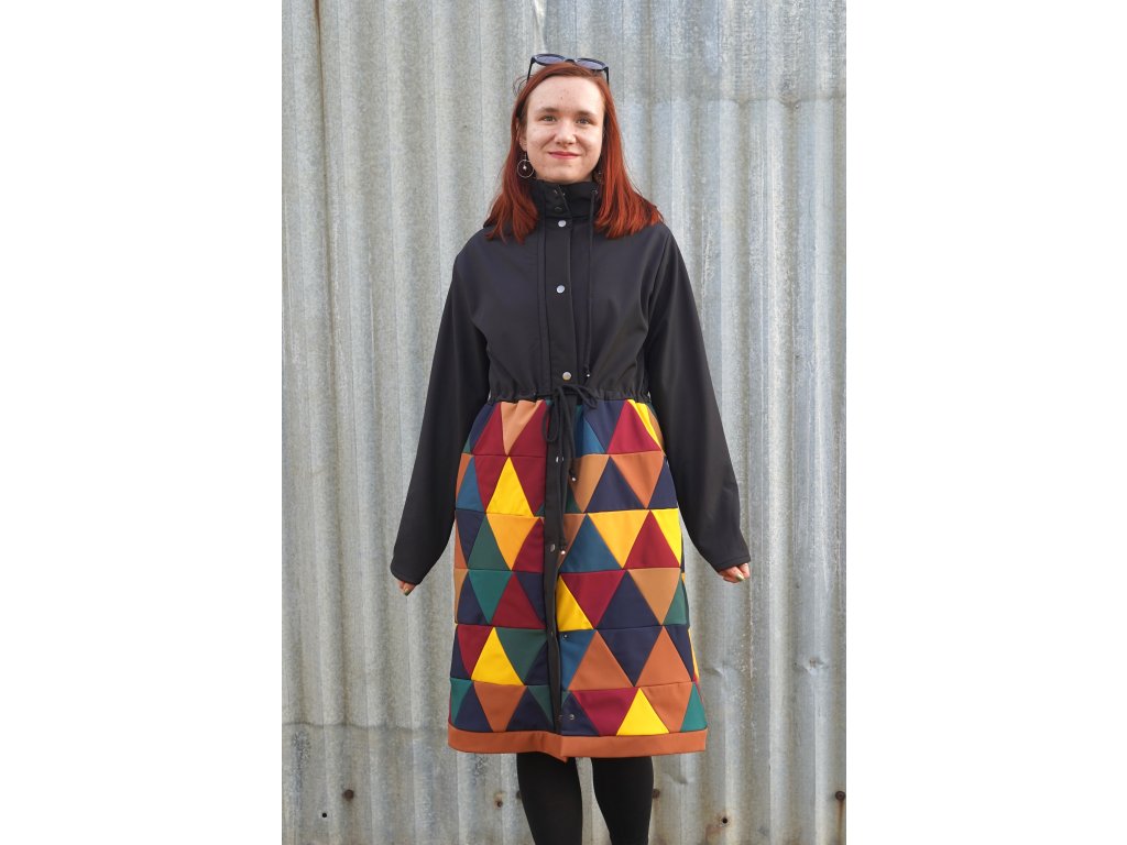Dolní část kabátu je realizována upcyklací zbytkových softshellů. Jednotlivé kousky jsou pečlivě stříhány a sešity v novou, trojúhelníkovou metráž. Tato část kabátu je podšitá.