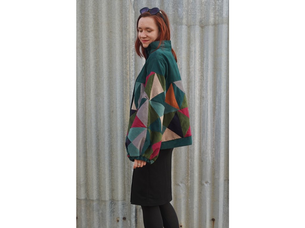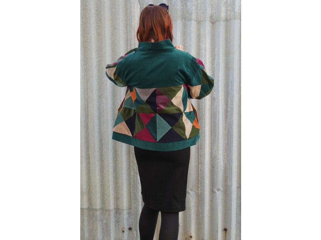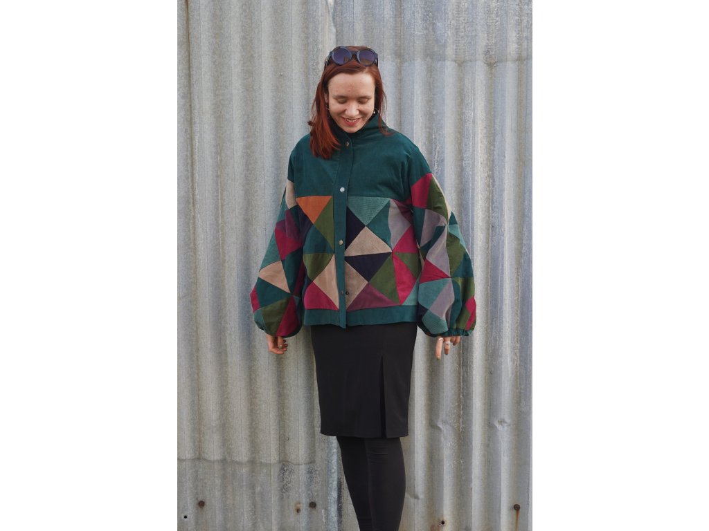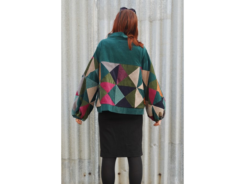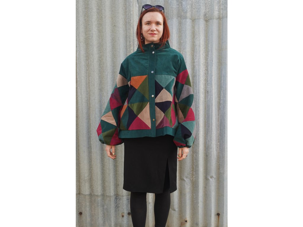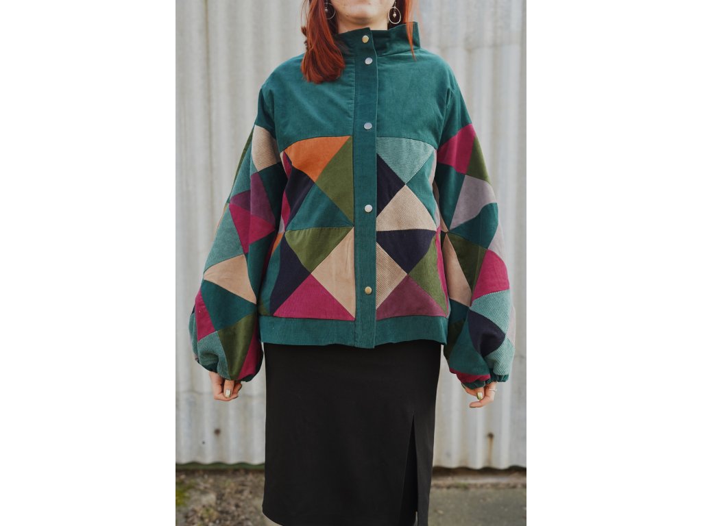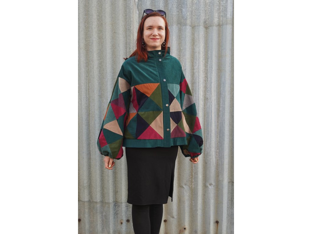 Upcyklovaná bunda z manšestru. Naprosto jedinečná. Bunda vznikla z pečlivého výběru a stříhání zbytkových manšestrů. Následně jsou kousky látek sešity v nový vzor. Bunda je střihu A, má volné rozšiřující se rukávy, které jsou u zápěstí staženy gumičkou. Má švové kapsy, které na první pohled nejsou vidět. Zapíná se na zip, který je překrytý légou s kovovými druky. Celá bunda je podšitá.