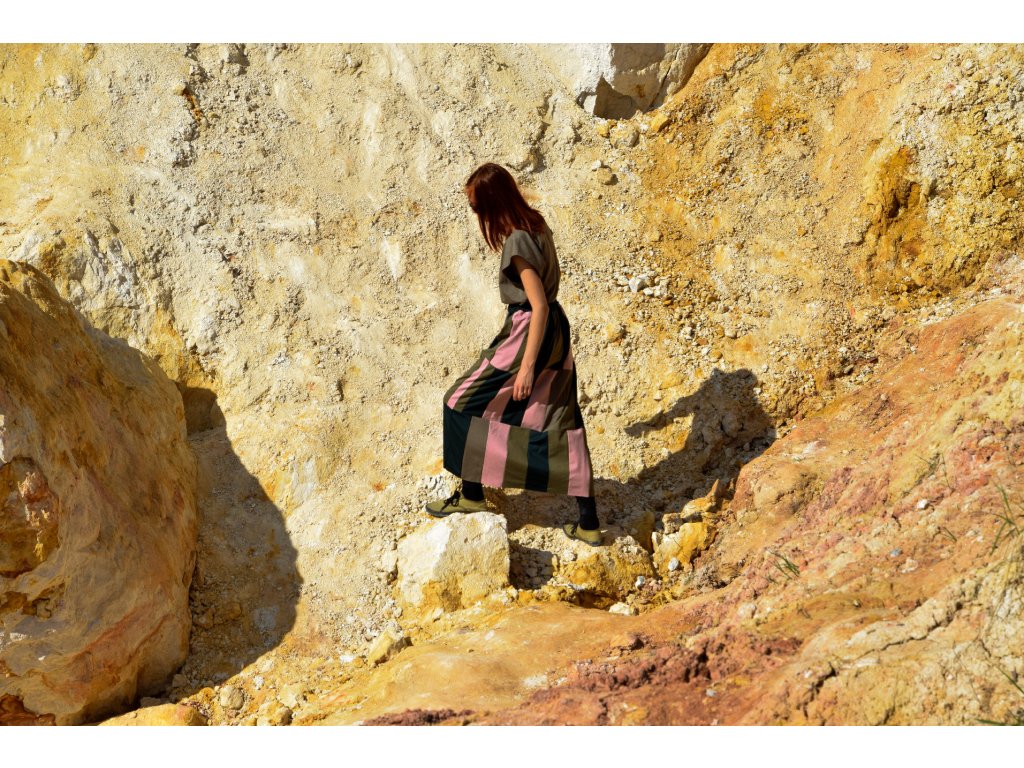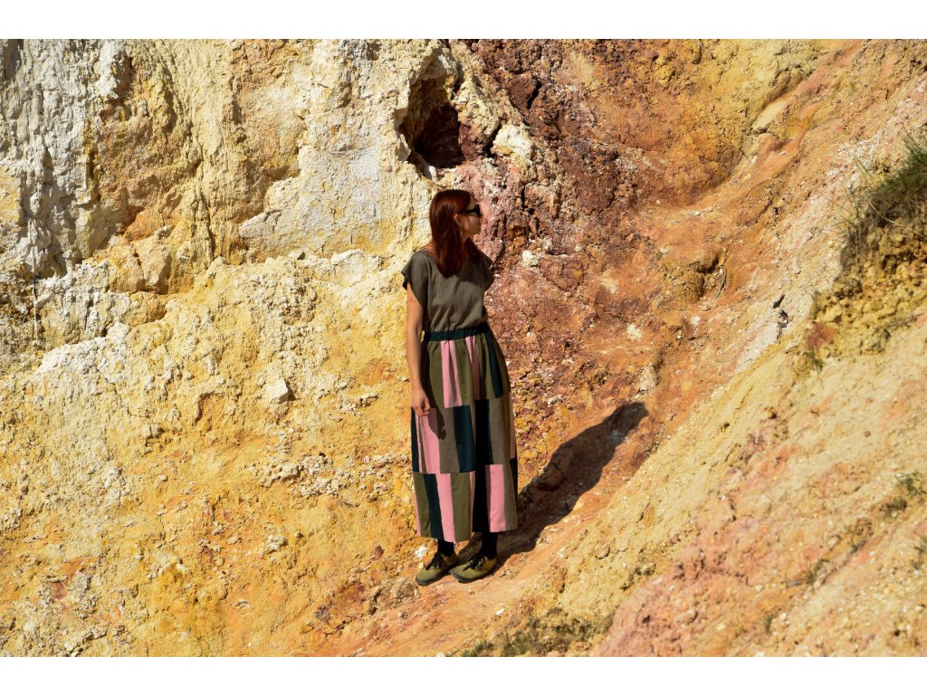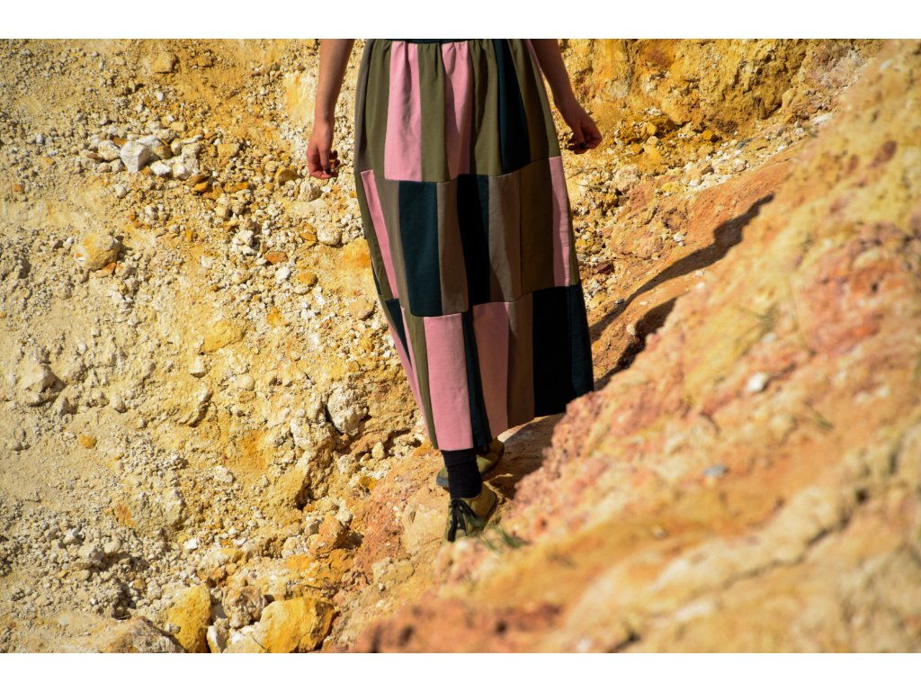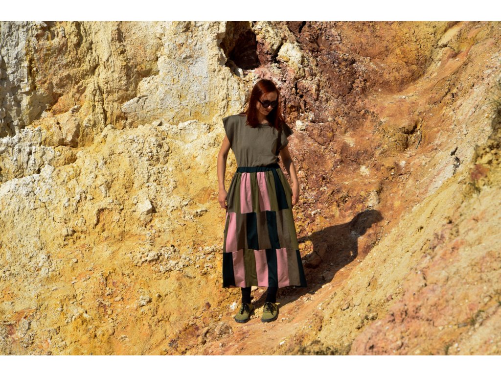 Horní díl šatů je z jednoho kusu látky, čímž vzniká minimalizace odpadu. V širším pásku je pevná guma, která se dá regulovat a přizpůsobovat obvodu pasu. Sukně šatů je objemná, ve švech jsou kapsy. Motiv vznikl pečlivým rýsováním, měřením, stříháním a sešíváním.