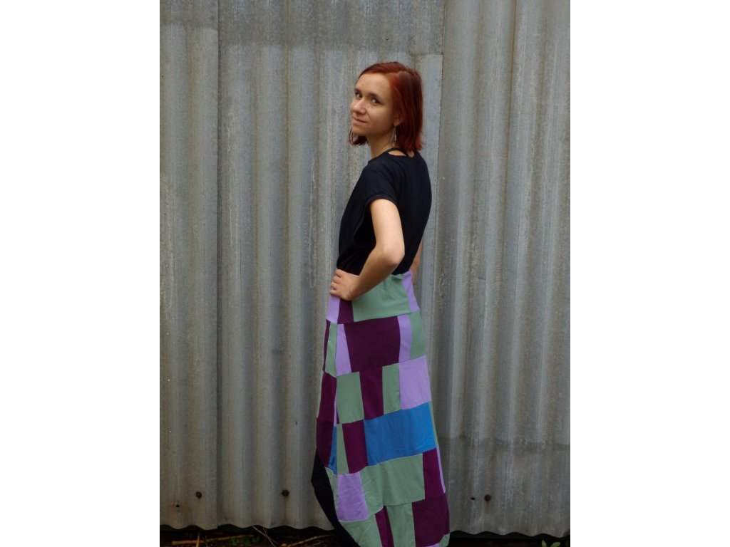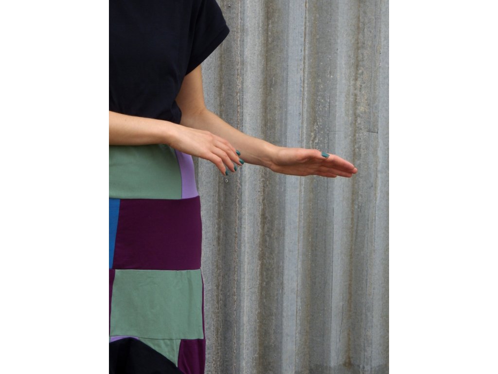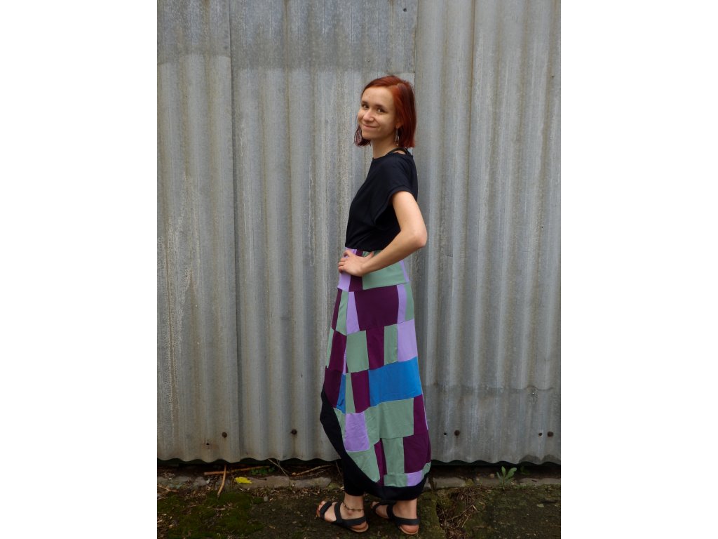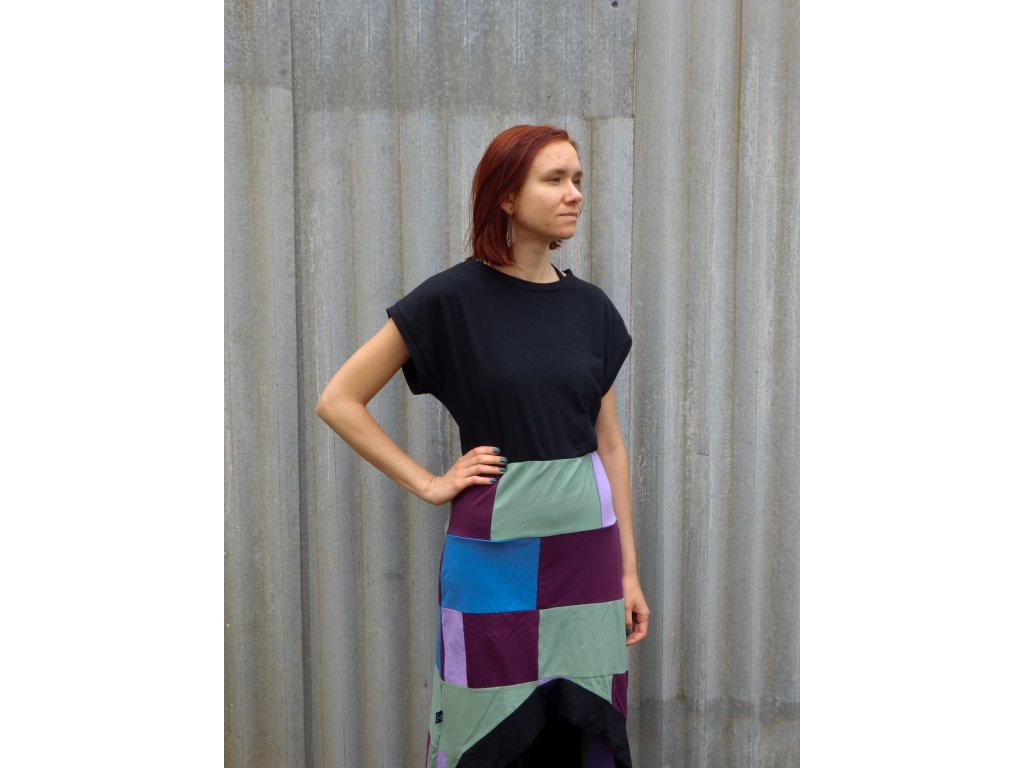 Pohodlné upcyklované letní šaty, které vznikly sešíváním zbytkových materiálů z oděvní výroby. Díky tomuto způsobu jsou jedinečné a navíc šetrnější k přírodě.
