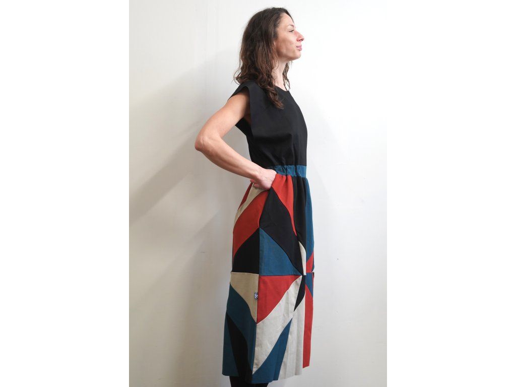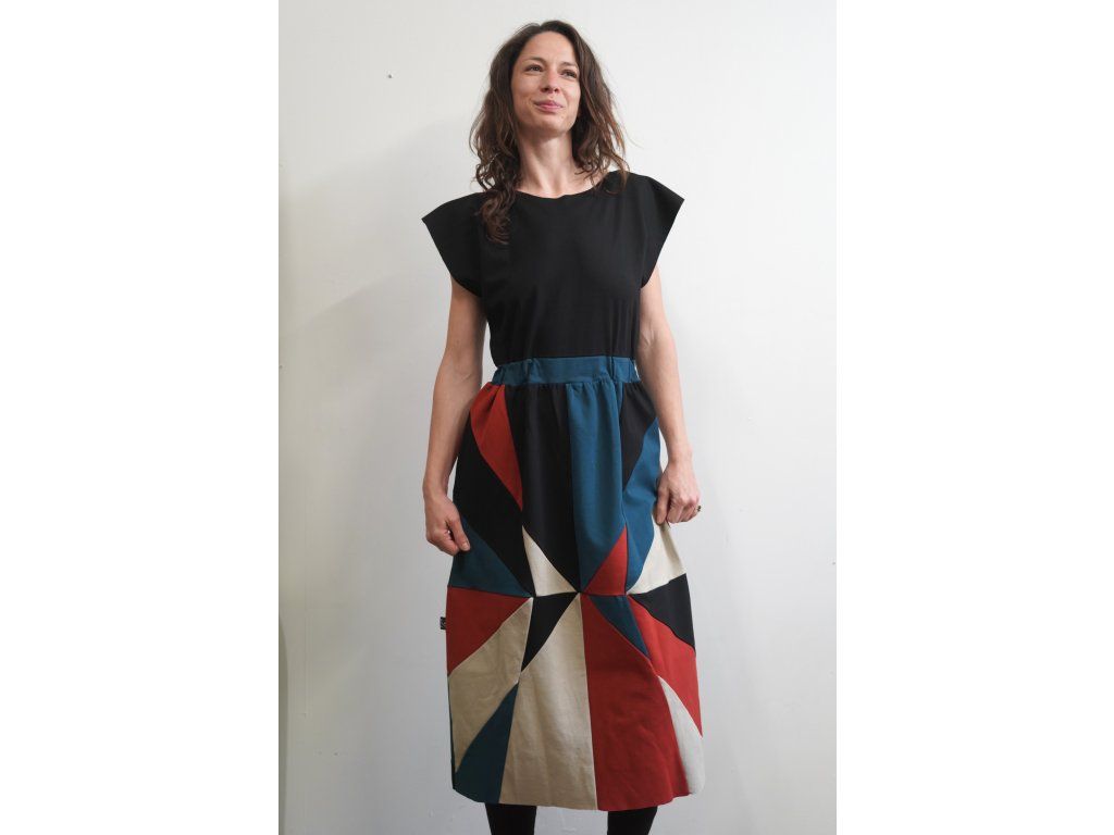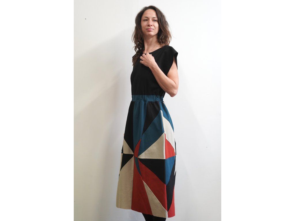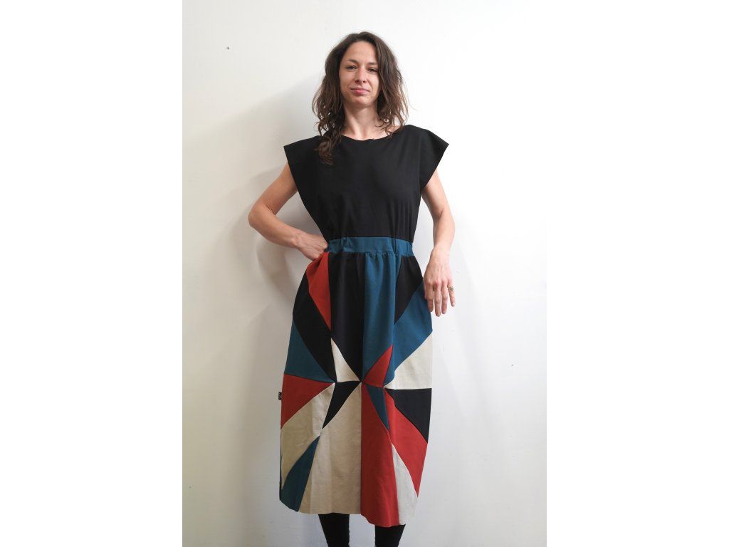 Horní díl šatů je z jednoho kusu látky, čímž vzniká minimalizace odpadu. V širším pásku je pevná guma, která se dá regulovat a přizpůsobovat obvodu pasu. Sukně šatů je objemná, ve švech jsou kapsy. Motiv vznikl pečlivým rýsováním, měřením, stříháním a sešíváním.