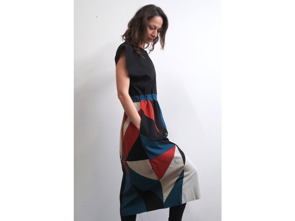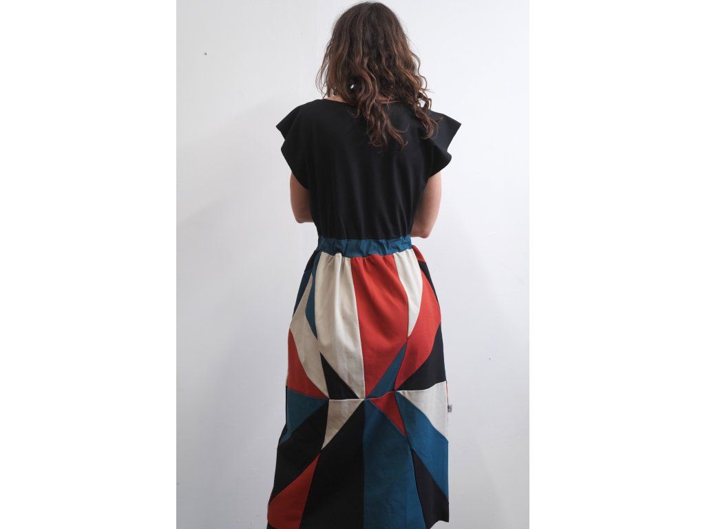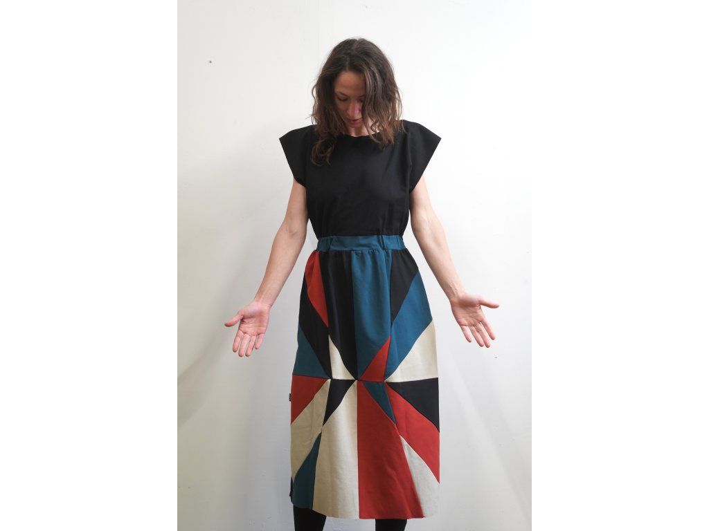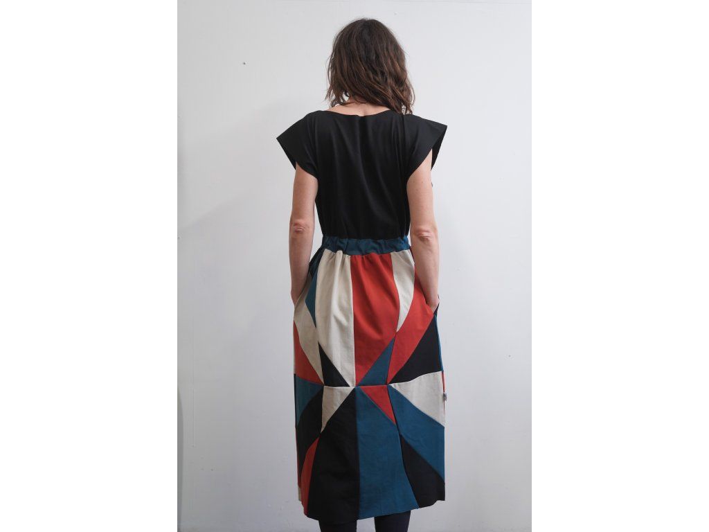 Horní díl šatů je z jednoho kusu látky, čímž vzniká minimalizace odpadu. V širším pásku je pevná guma, která se dá regulovat a přizpůsobovat obvodu pasu. Sukně šatů je objemná, ve švech jsou kapsy. Motiv vznikl pečlivým rýsováním, měřením, stříháním a sešíváním.