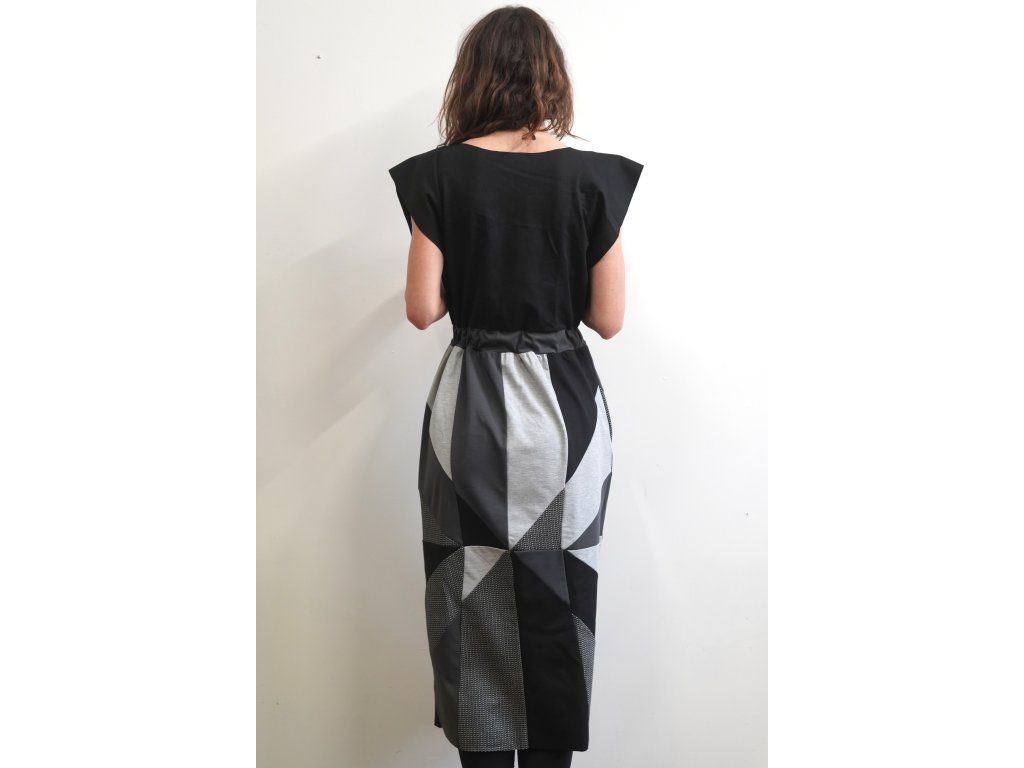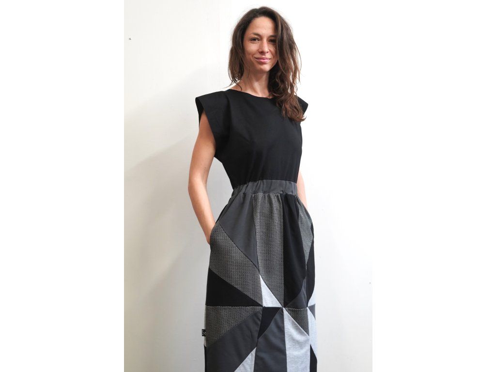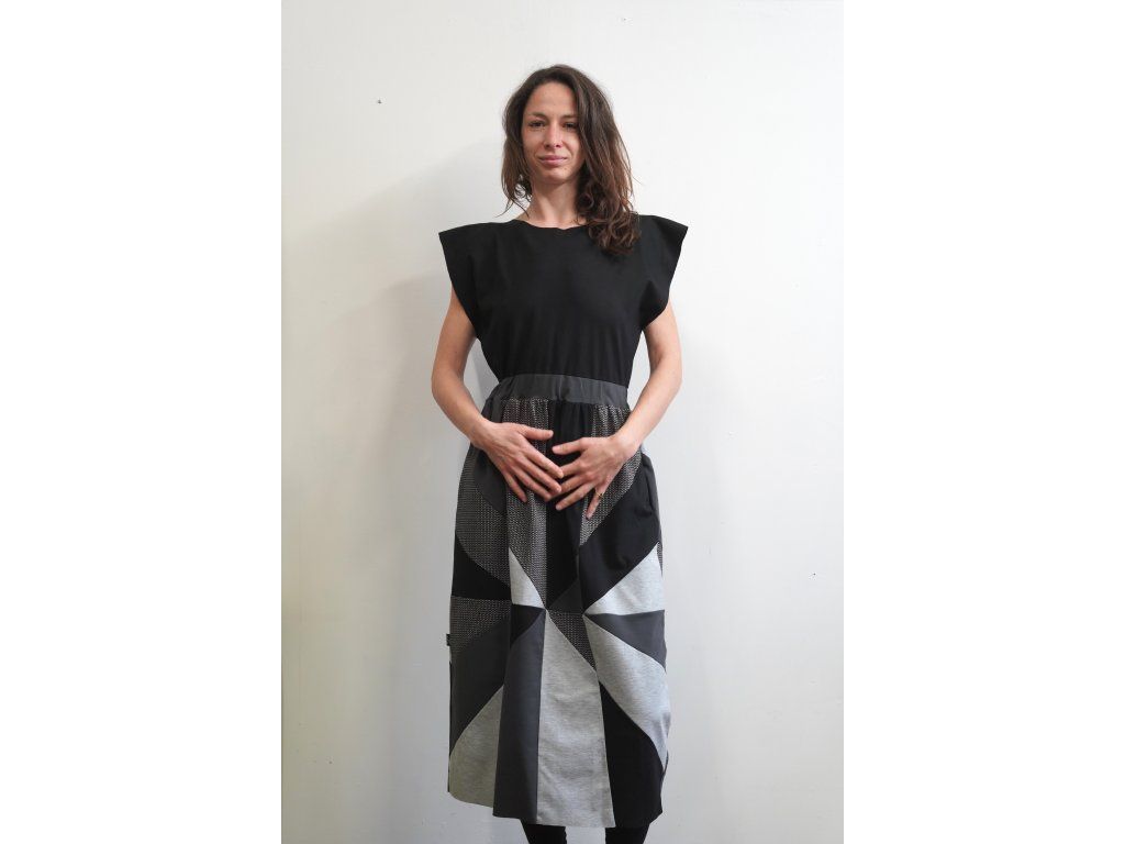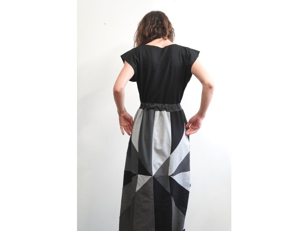 Horní díl šatů je z jednoho kusu látky, čímž vzniká minimalizace odpadu. V širším pásku je pevná guma, která se dá regulovat a přizpůsobovat obvodu pasu. Sukně šatů je objemná, ve švech jsou kapsy. Motiv vznikl pečlivým rýsováním, měřením, stříháním a sešíváním.
