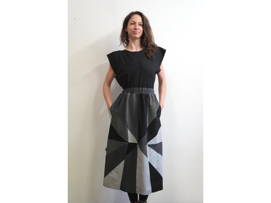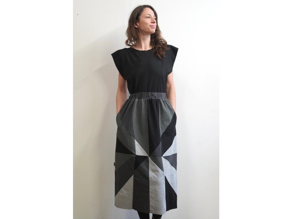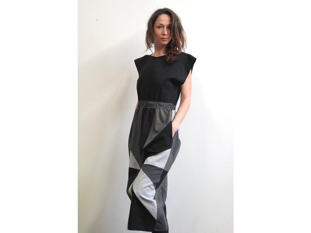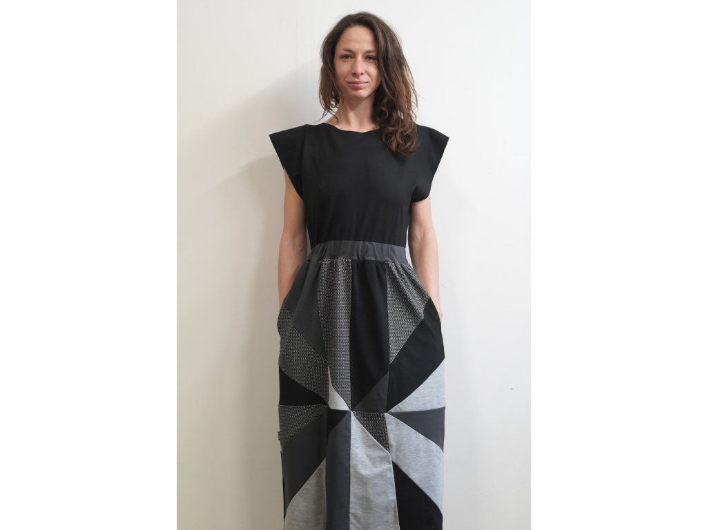 Horní díl šatů je z jednoho kusu látky, čímž vzniká minimalizace odpadu. V širším pásku je pevná guma, která se dá regulovat a přizpůsobovat obvodu pasu. Sukně šatů je objemná, ve švech jsou kapsy. Motiv vznikl pečlivým rýsováním, měřením, stříháním a sešíváním.