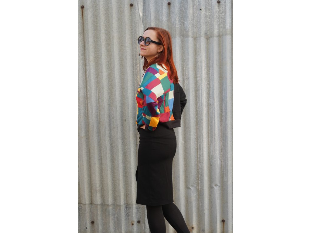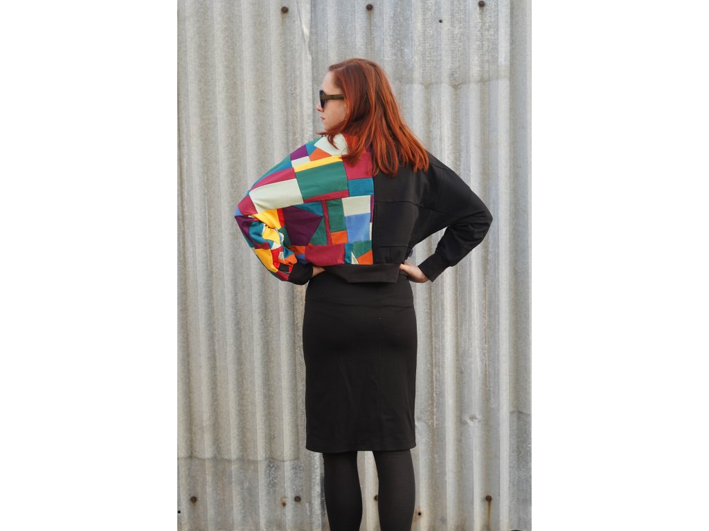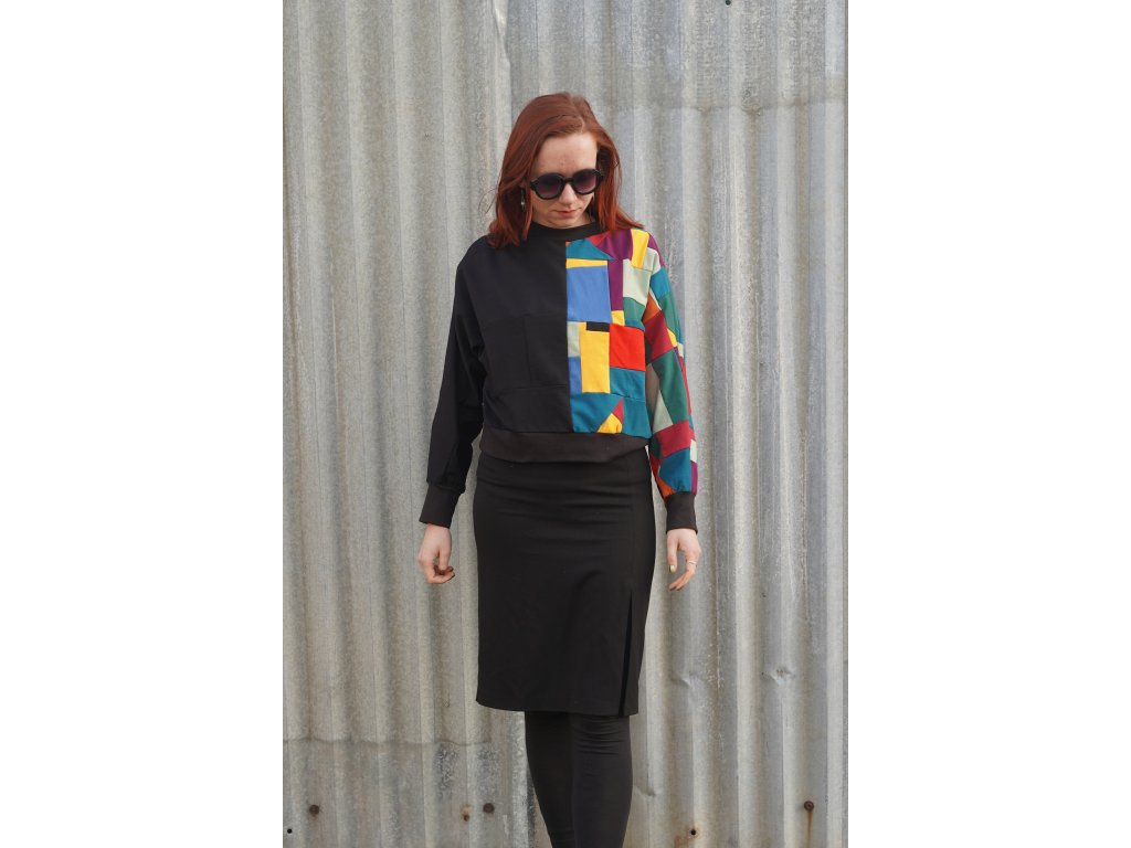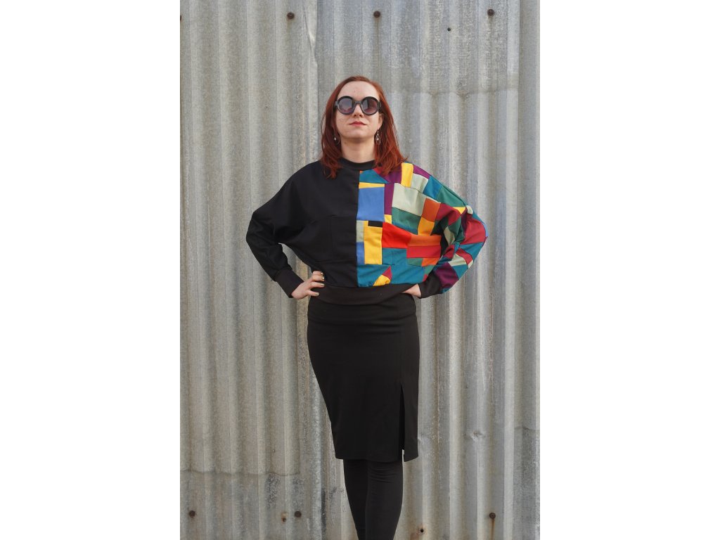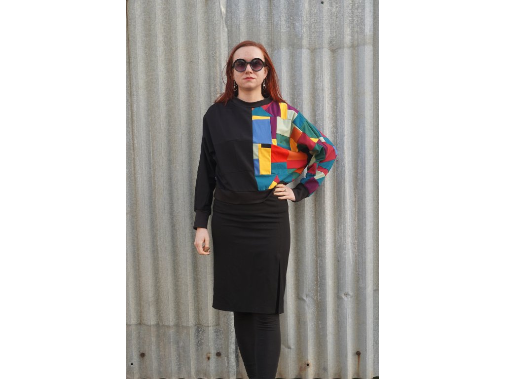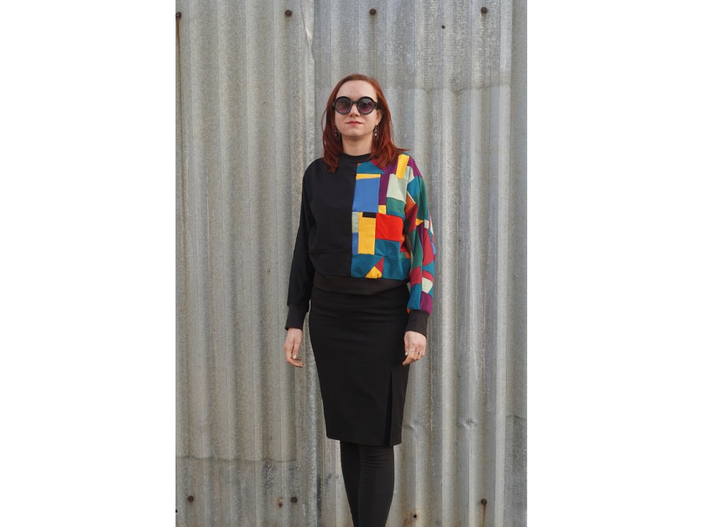 Mikina, která vznikla upcyklací zbytkových materiálů z oděvní výroby. Má přinechané rukávy, je do pasu a samozřejmě jedinečná, originální.