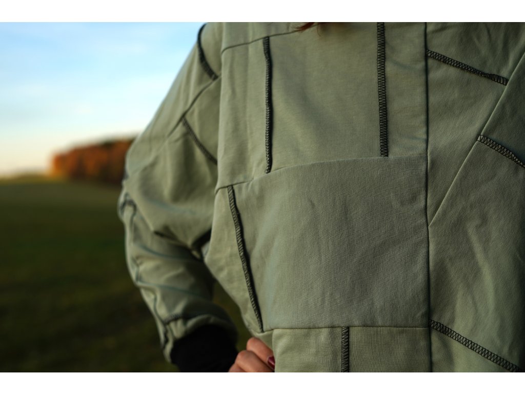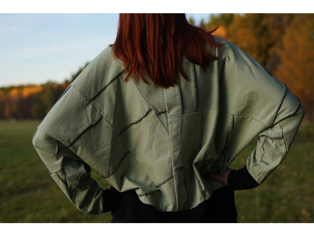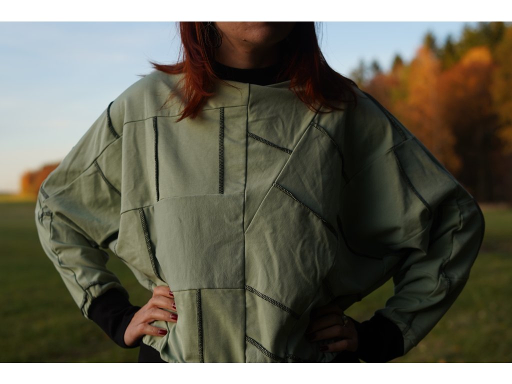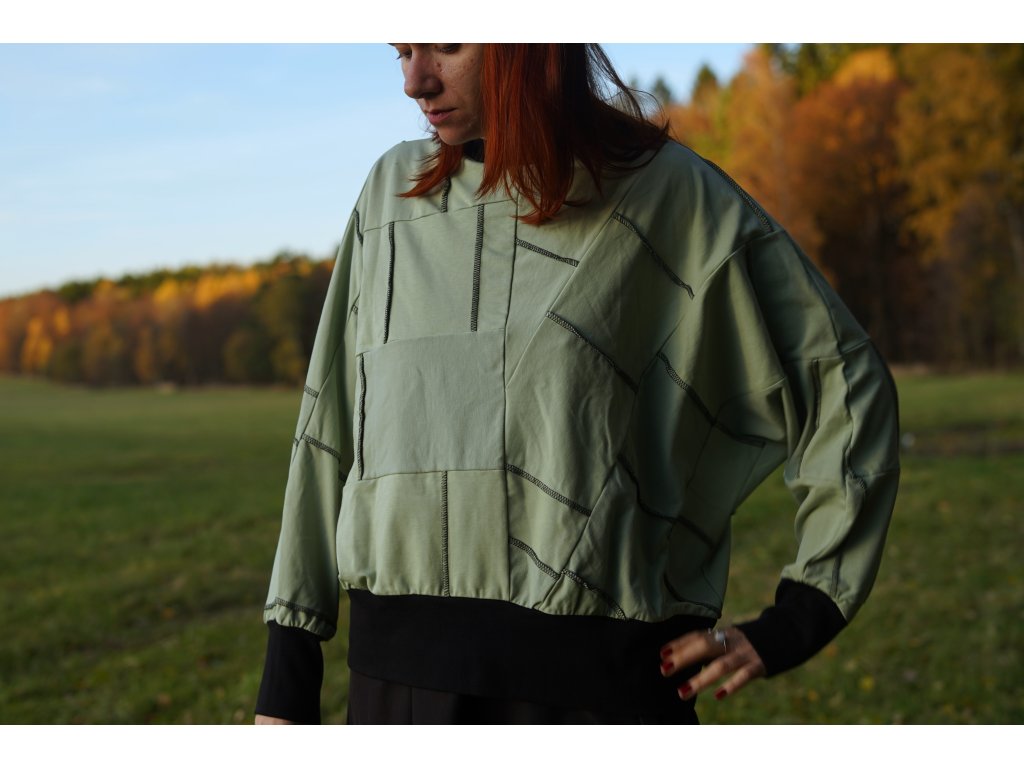 Mikina, která vznikla upcyklací zbytkových materiálů z oděvní výroby. Má přinechané rukávy, je do pasu a samozřejmě jedinečná, originální.